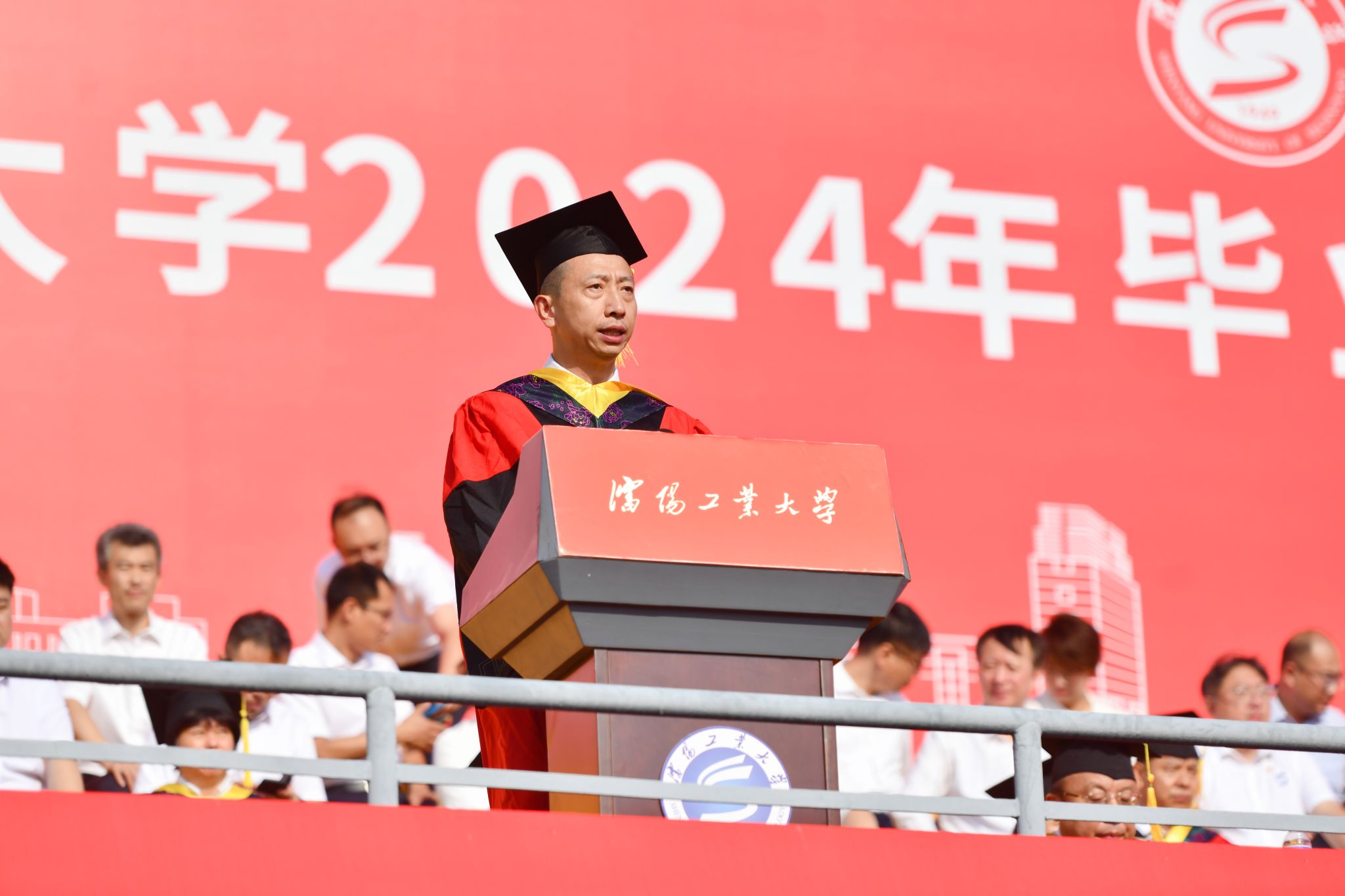 贾玉明深情回顾了毕业生们在校期间青春记忆中的闪耀瞬间,盘点了全校师生共同经历的一场场重要考验,细数了学校在“双一流”建设中取得的一项项重大发展成就。他表示,过去几年,广大学子以奋发向上的精神面貌与学校携手逐梦,共同进步,亲历并见证了学校发展进程中的重要历史时刻,学校开拓进取,创新发展,综合排名稳步提升,社会影响力不断扩大,向同学们展示了一个更显颜值、更具底蕴、更有温度、更富实力的沈工大。